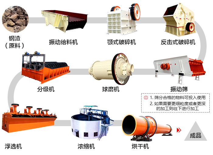 在振動給料機(jī)的作用下,將堆積的鋼渣均勻、連續(xù)的送到顎式破碎機(jī)進(jìn)行粗碎加工,粗碎后的鋼渣通過振動篩,合格的進(jìn)入反擊式破碎機(jī)或圓錐破碎機(jī)進(jìn)行中、細(xì)碎加工,不合格的返回上層繼續(xù)破碎,相同的經(jīng)反擊式破碎機(jī)或圓錐破碎機(jī)破碎后的鋼渣合格的通過輸送機(jī)輸出,即為成品,不合格的返回繼續(xù)破碎加工。
